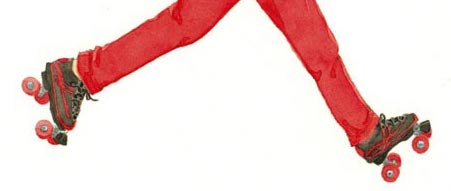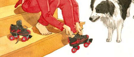 Early the next morning, Johnny tiptoed down to the basement in his pajamas, looking for his roller skates. He put them on and imagined that he was standing in an ice rink in front of a big crowd. He tried to spin. He could glide on one foot, so he tried lifting one leg up high in a spiral position. He tried a jump. He loved it.